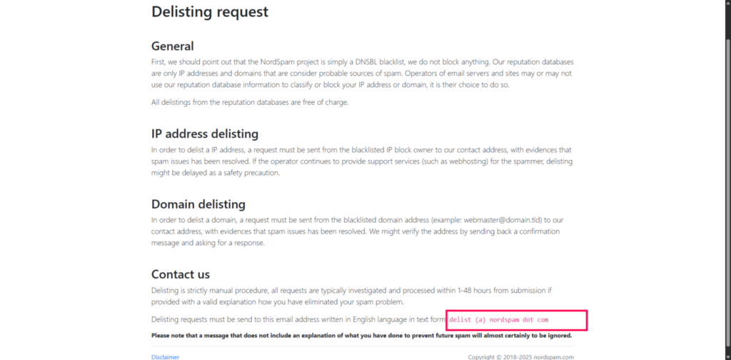 - Write an email mentioning everything & then send it to delist@nordspam.com