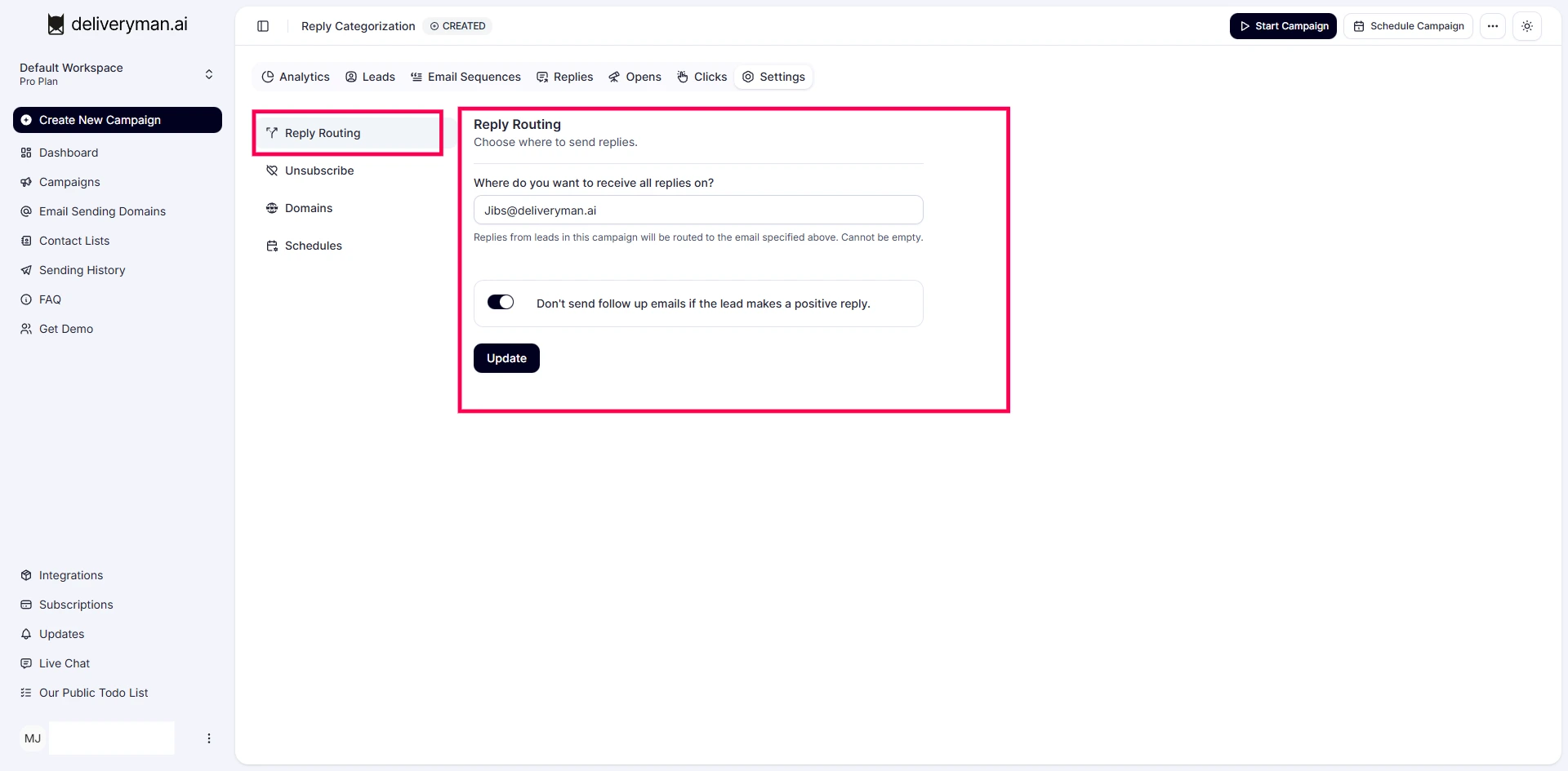 Reply Routing is designed to make your workflow smoother. It lets you send all replies from each campaign directly to any email address you choose.