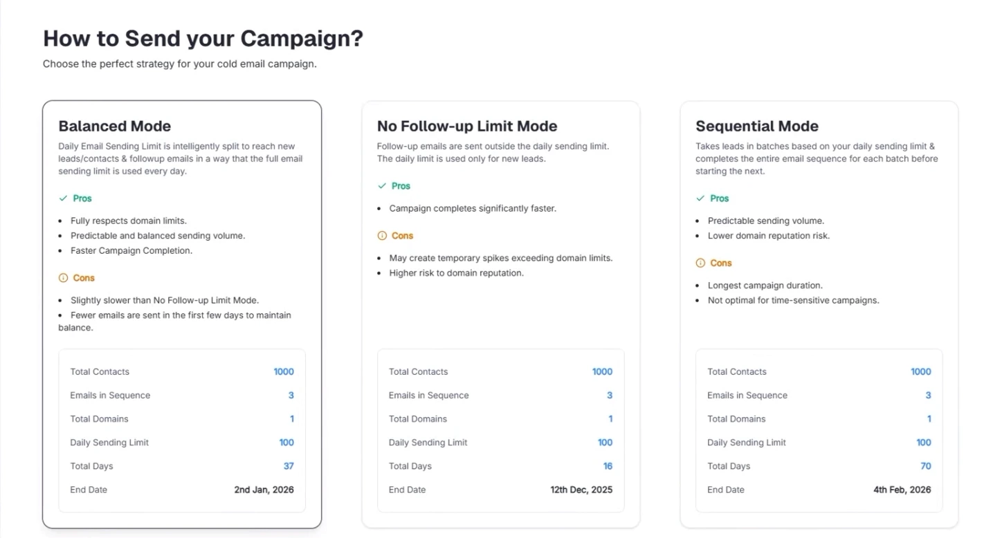 Balanced Mode distributes new outreach emails and follow-up emails in a way that ensures the daily sending limit is used efficiently without exceeding it. This creates the most consistent and reputation-friendly sending pattern.
