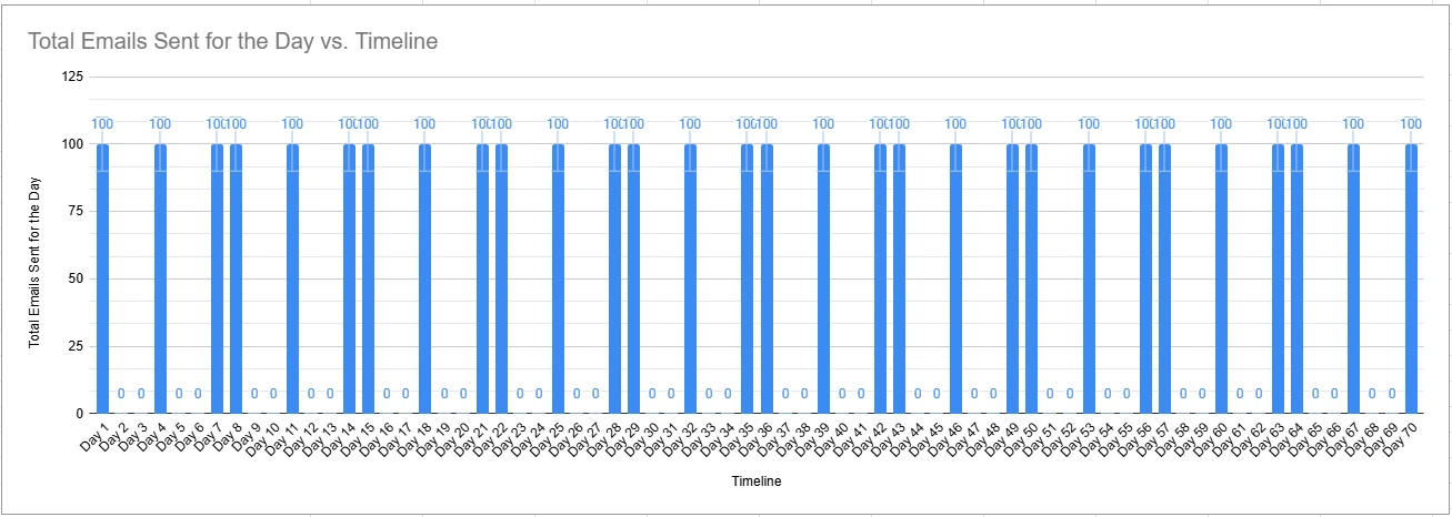 Instead of sending 100 new contacts per day, the system sends 33 per day. As follow-up emails begin, each day contains a mix of new emails and follow-ups. The total volume gradually increases, reaches the daily limit, and stays consistent.