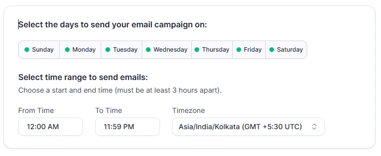 Choose the days when emails are allowed to send, from Monday to Sunday.