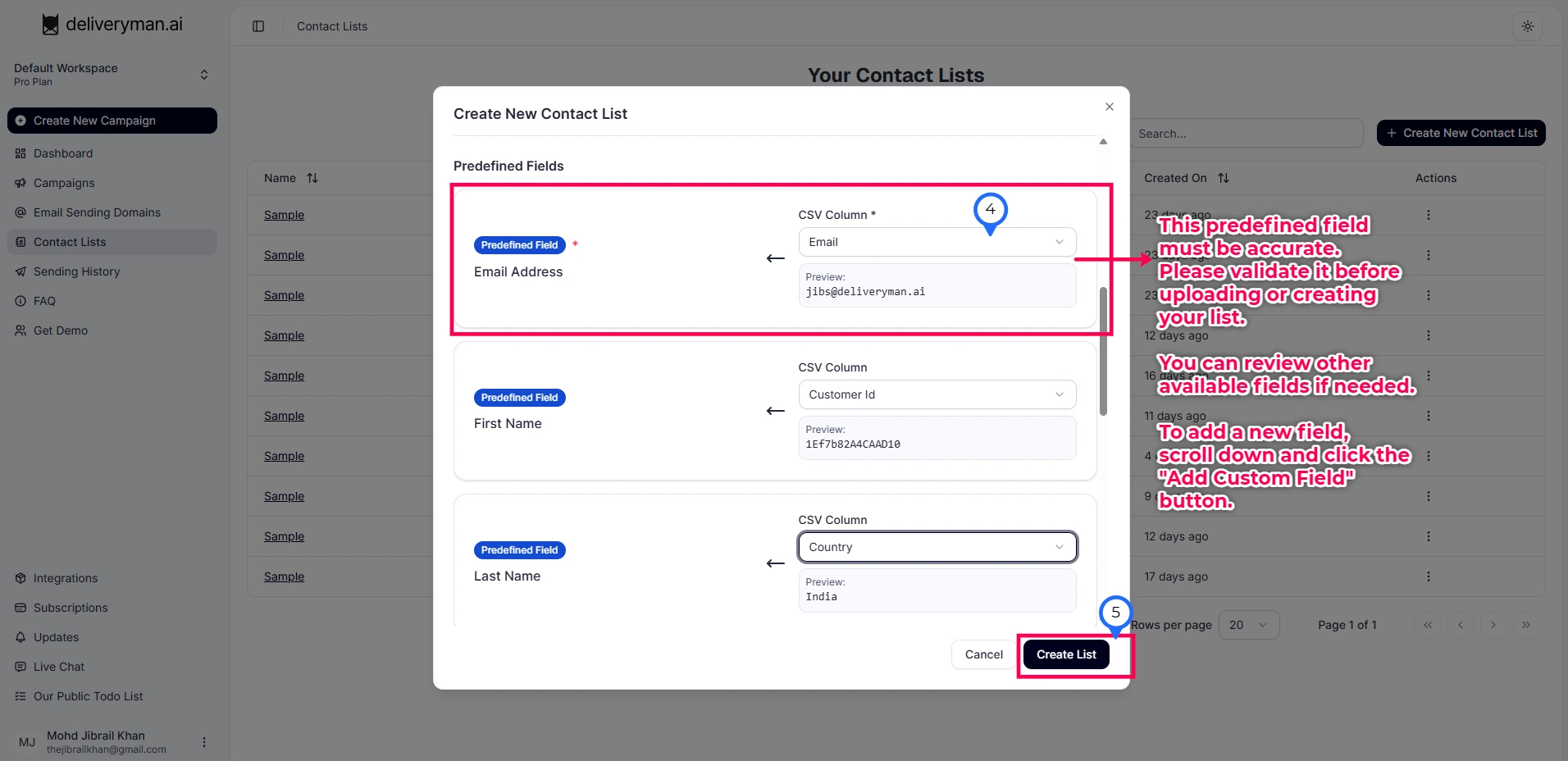 After importing your contact list, you will be guided through a field mapping step to match your data with the correct predefined fields. This ensures your contacts are properly structured and ready to use in campaigns.